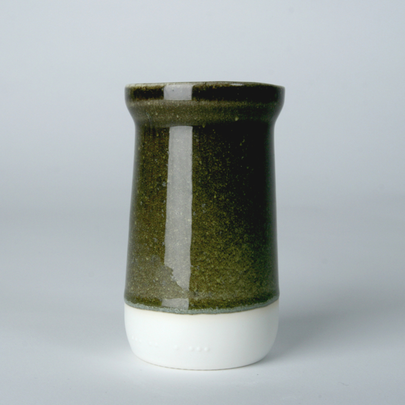ENKEL GLAS was designed in 2015, to research the possibilities of using waste packaging glass as a ceramic glaze. The fine glass dust used for this glaze, is polluted with small bits of metal and other materials, showing as little dots and discolourations in the glaze. The design of the cup shows details from old glass jars, to refer to the origin of the glaze.